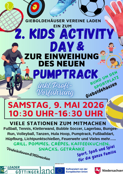 Der Kids Activity Day in Gieboldehausen bringt zahlreiche örtliche Vereine zusammen, die Kindern ihre Sport- und Freizeitangebote präsentieren. Geplant sind vielfältige Mitmachstationen wie Fußball, Tennis, Tanzen, Volleyball, Kletterwand, Lichtpunktschießen, Feuerwehr, Lagerbau, Hüpfburg, Bubblesoccer sowie Pumptrack- und Dirttrack-Angebote.
